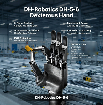 The DH-Robotics DH-5-6 is a 5-finger tendon-driven dexterous robotic hand with 6 active degrees of freedom. It is designed for humanoid robots, collaborative robots and research platforms that require human-like grasping, force control and perception. The hand uses integrated micro linear actuators and supports hybrid position-force control for precise and compliant manipulation.